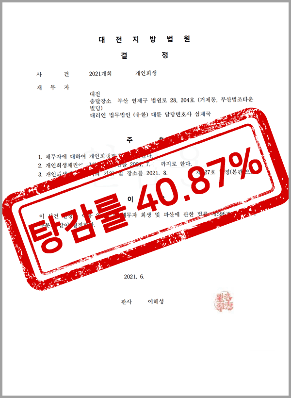 원금의 40.87%를 탕감 및 36개월 변제를 하는 것으로 개시결정