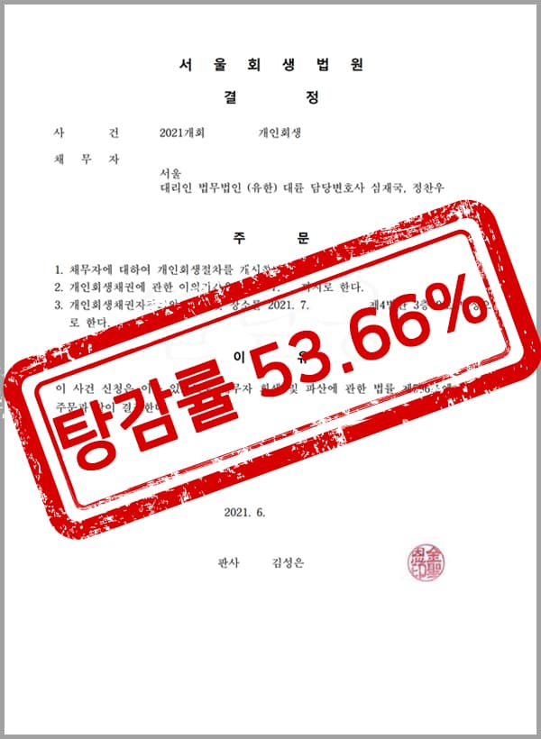 원금의 53.66%를 탕감 및 36개월 변제를 하는 것으로 개시결정